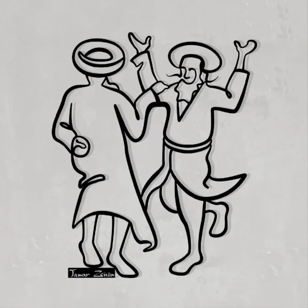Metal artwork of Hasidim dancing, beautifully capturing the joy and spirituality of traditional Jewish life.