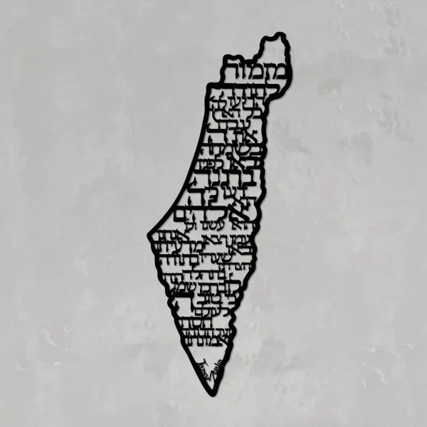 Metal artwork in the shape of the map of Israel, featuring the chapter ‘Mizmor LeToda’ from the Tehilim (Psalms).