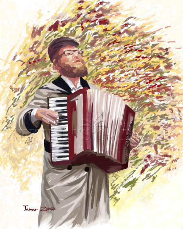 Painting of a Hasidic playing the accordion full of joy and cheerfulness as is the best tradition of the Hasidic musicians in the towns and the holy courts.